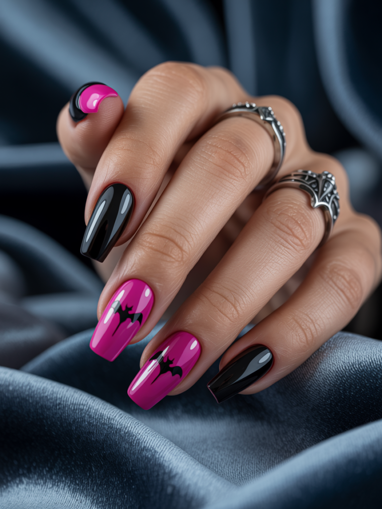 Neon pink as a base is bold, energetic, and impossible to ignore — exactly what the pink goth aesthetic is all about. The electric tone creates a vivid canvas that makes any dark detail placed on top of it pop intensely. Black bat silhouettes stamped or painted near the tips add a playful gothic touch to the vibrant base.