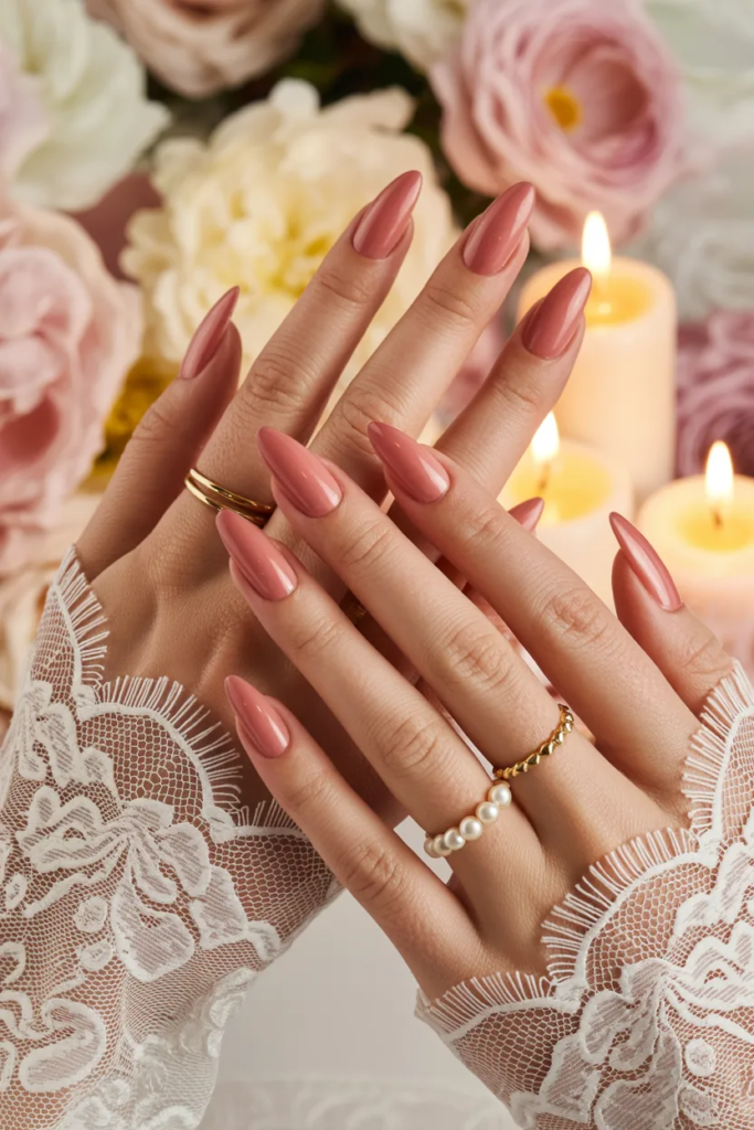 Rose pink almond nails are a stylish and feminine option for brides who want a refined manicure. The almond nail shape naturally elongates the fingers, giving the hands a graceful and elegant appearance.