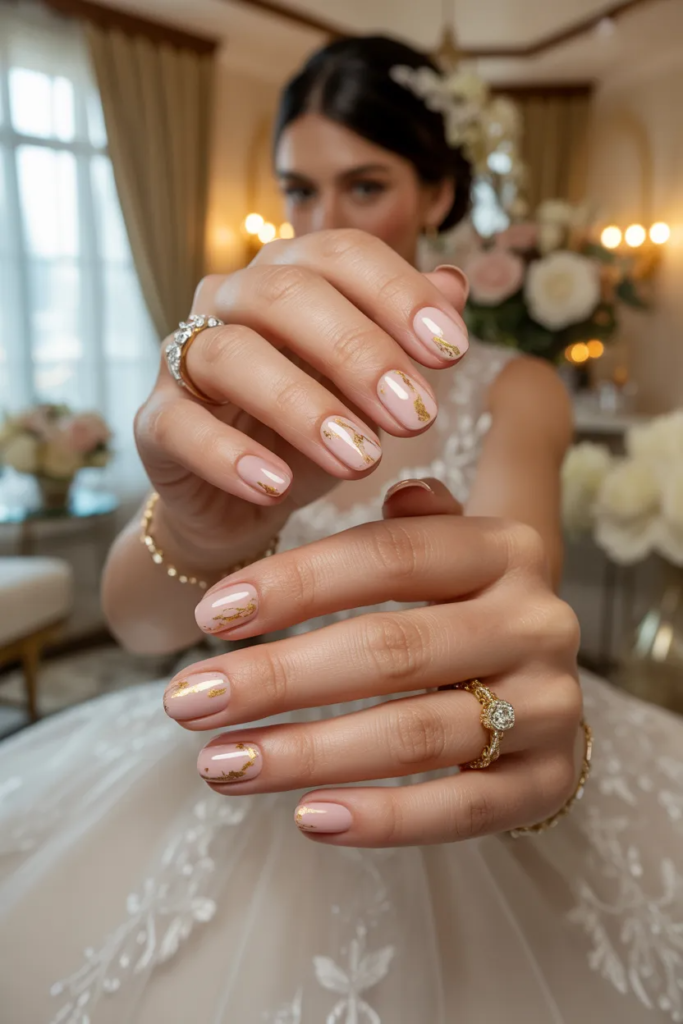 Pink nails with gold foil add a luxurious and glamorous touch to a bridal manicure. The delicate gold foil pieces placed on a soft pink base create a beautiful contrast that feels both elegant and eye-catching.