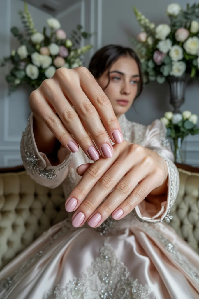 Pale pink minimalist nails are perfect for brides who appreciate simplicity and elegance. This soft and delicate shade gives the nails a clean and polished appearance without heavy decoration. The gentle color highlights the natural beauty of the hands.