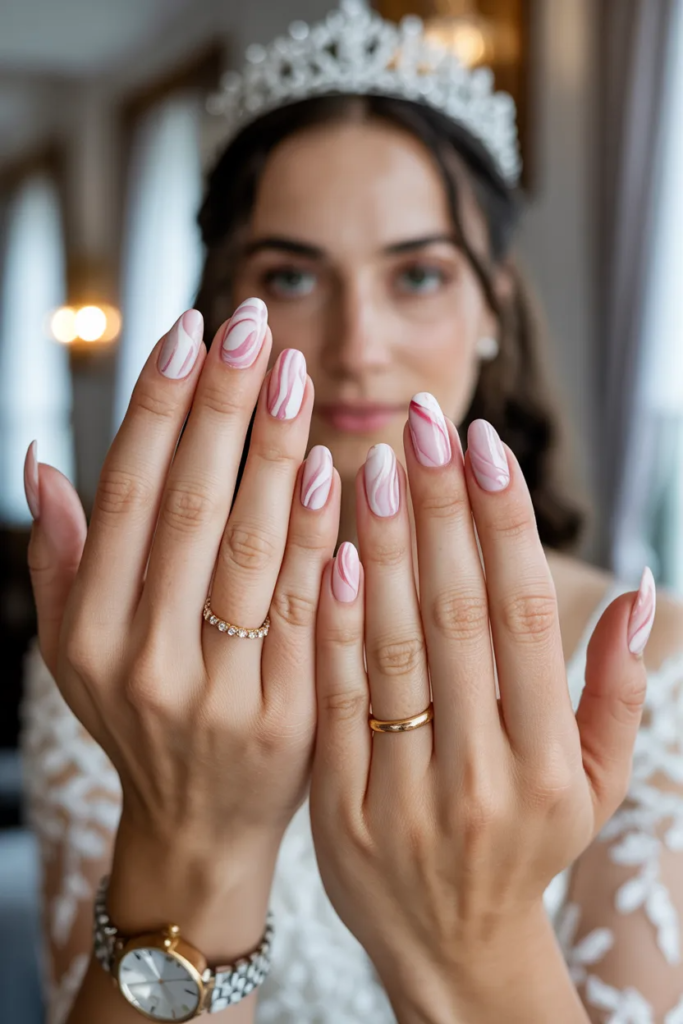 This style is ideal for brides who want something creative yet sophisticated. Each nail has a slightly different marble pattern, which makes the manicure feel special and one of a kind. It adds a touch of modern artistry to the bridal look.