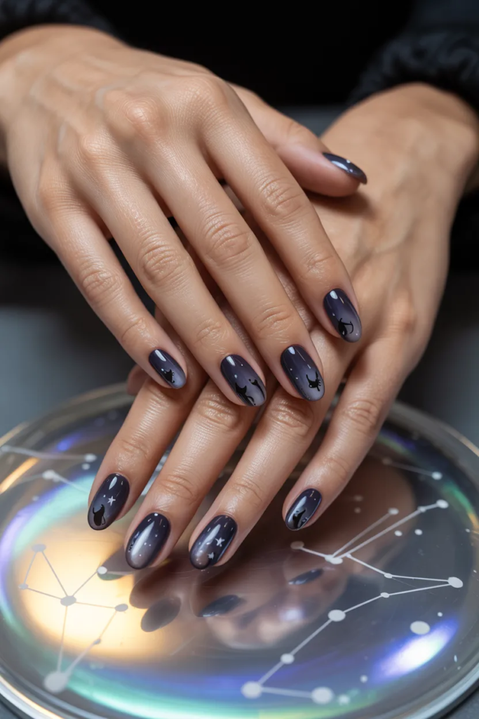 Dark gradient nails fading from deep navy to black feature tiny black cat silhouettes and star detailing. Perfect for a mystical, celestial Halloween vibe.