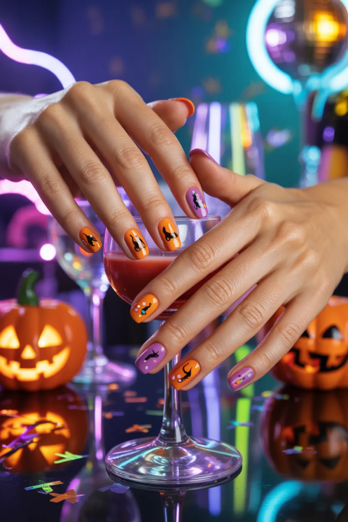 Bright orange or purple nails with playful black cats and confetti accents make a fun, festive Halloween manicure. Ideal for short or medium nails.