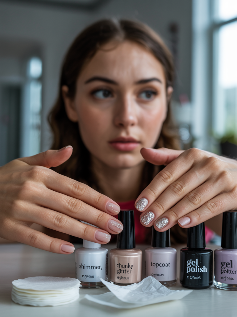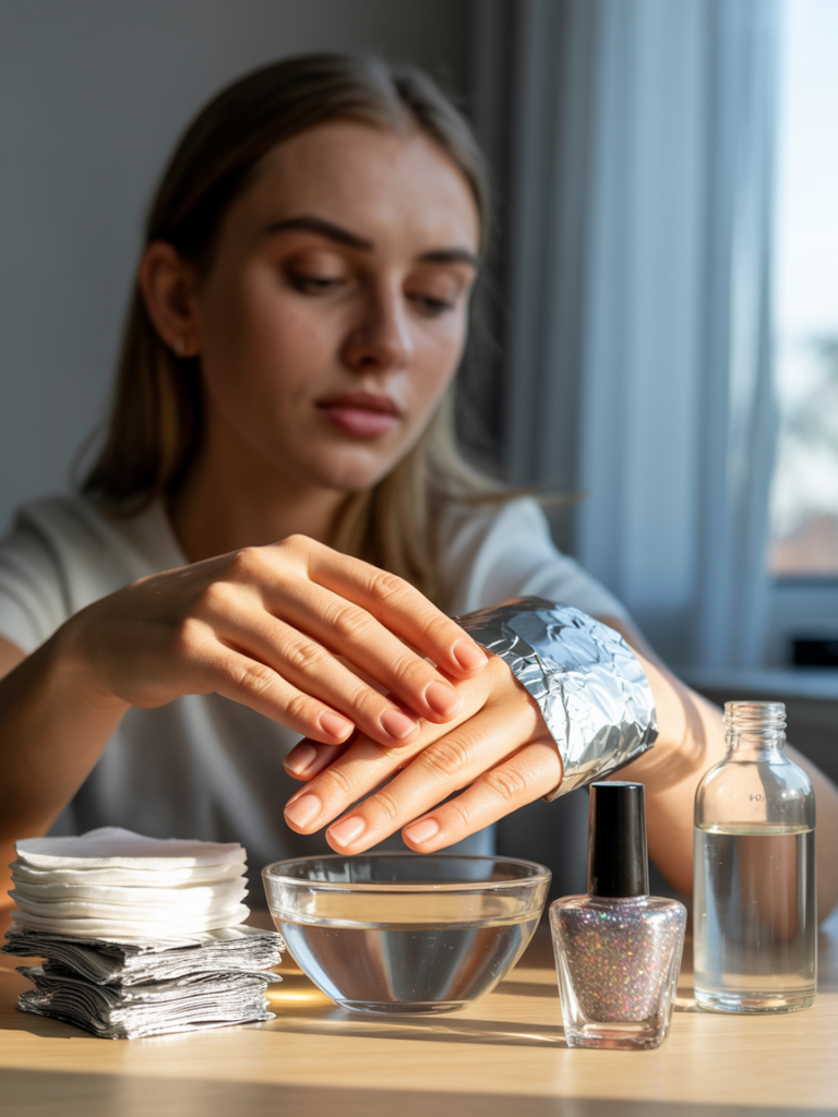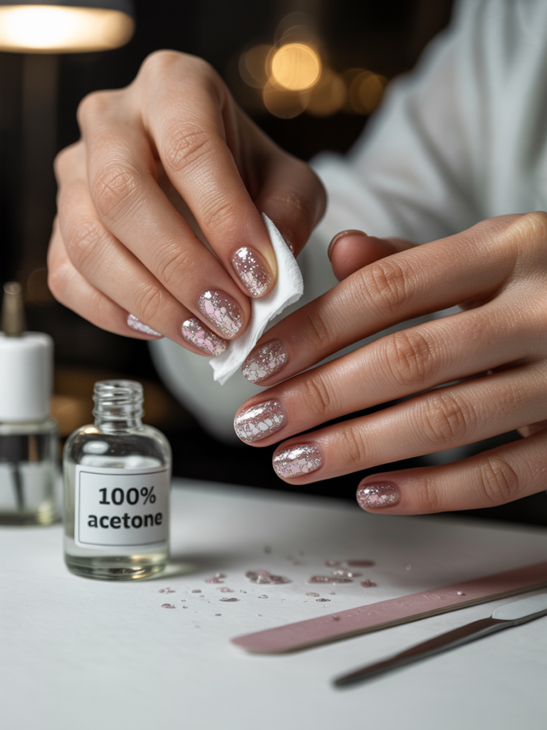 - Gel glitter polish requires a completely different approach — gel-specific acetone removal with longer soak times of 20–30 minutes or professional removal at a salon.