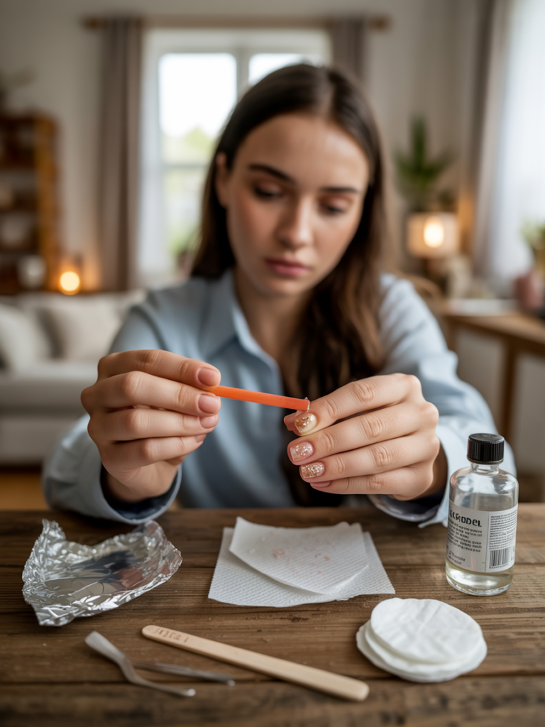 - If particles are still clinging, simply re-soak a cotton ball with acetone, press it on the nail for another 30–60 seconds, and wipe again.
