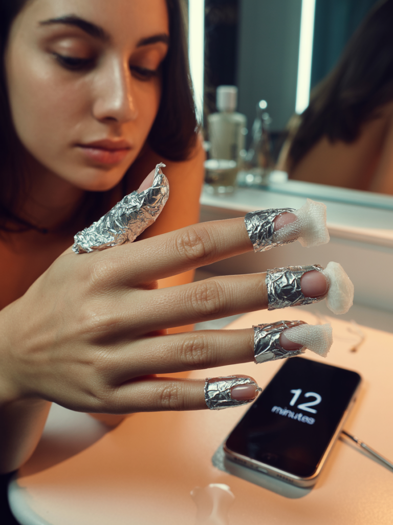- If you remove the foil at 5 minutes, you’ll find yourself scrubbing and re-soaking — which takes more time overall and damages nails.