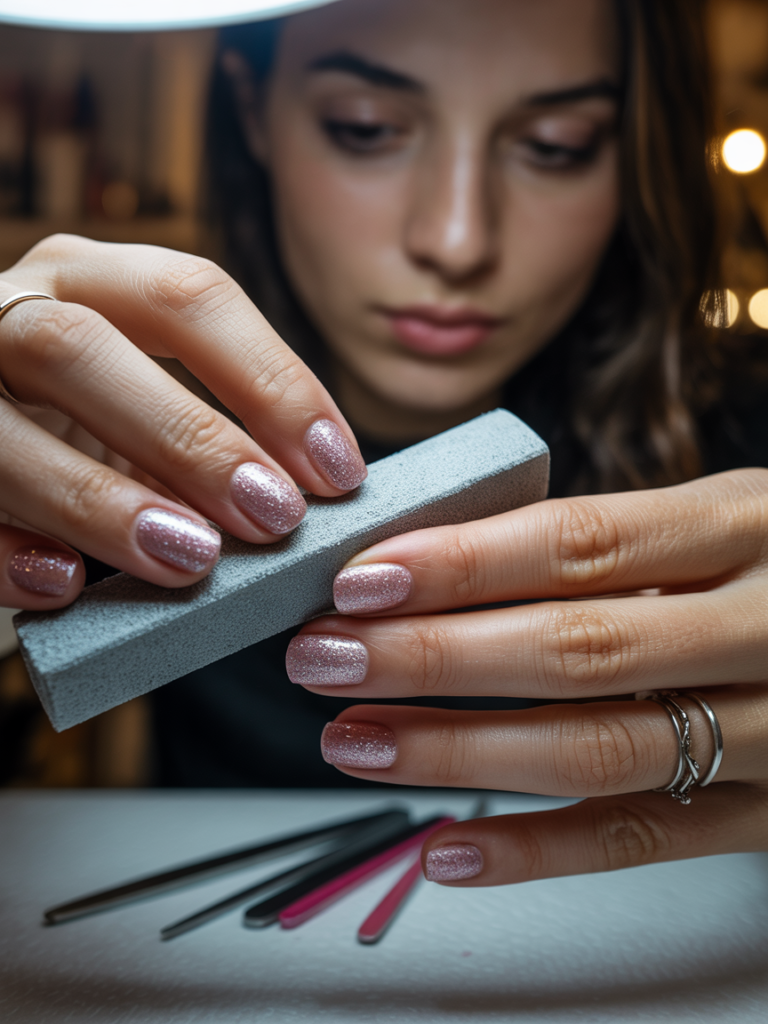- You don’t need to file aggressively — just two or three light passes across the nail surface is enough.